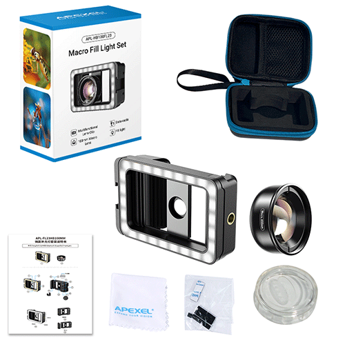 Model NO. APL- HB100FL23 Main Function 100MM Macro Lens + LED lights Main Material Optical glass + Aluminum Alloy +ABS + Genuine Leather Box Dimension / Weight / Color Black Package Color Box Lens Construction 5 Elements 4 Groups Features "Distortion: < 2% AR Coating: Multi-layer Focal Length: 50mm Focusing Range: 40mm - 60mm (the best distance 55mm) Diameter: 40mm Screw Interface: M17x 0.75 " Unique Hightlights "1.with a LED fill light in front provides more lights; 2.the firm adapter with a built-in tripod socket and even a cold shoe to mount other devices; 3.100mm macro lens provides more fine details;" Compatible With "for 98% of mobile phone " Package Included "1x 100mm Macro Lens 1x LED light Clip 1x Charging Cable 1x Carrying bag 1x Cleaning Cloth 1x User Guide"